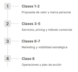 El programa costa de 8 clases intensivas que cubren todo el ciclo comercial y de marketing de tu negocio de servicios profesionales: